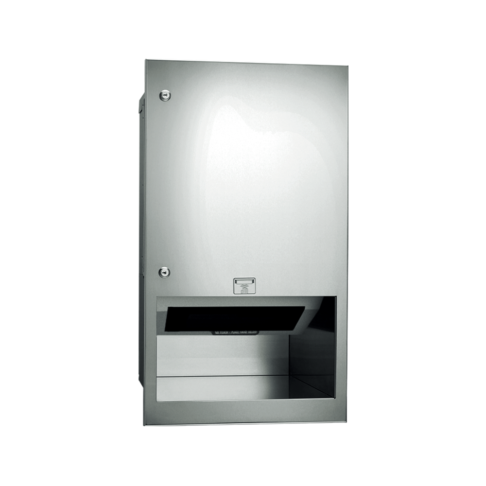 Das berührungslos arbeitende Gerät spendet eine vom Besitzer einstellbare Länge pro Zyklus von 8″ (205 mm) breiten, 244 m (800 ft.) langen Rollen. Hergestellt aus rostfreiem Stahl der Stärke 20 mit satinierter Oberfläche.