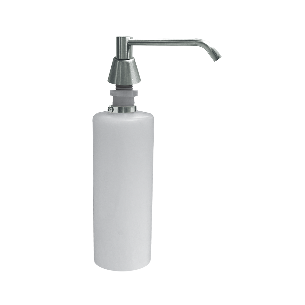 Robinet résistant à la corrosion avec bec en acier inoxydable et plaque d'encastrement en laiton chromé. Distribue 20 oz (0,06 litre) de savons liquides et en lotion, de détergents synthétiques et de savons antibactériens. Le réservoir de savon est en polyéthylène translucide et incassable. Le bec anti-vandalisme doit pouvoir pivoter sur 360° sans endommager l'appareil.
