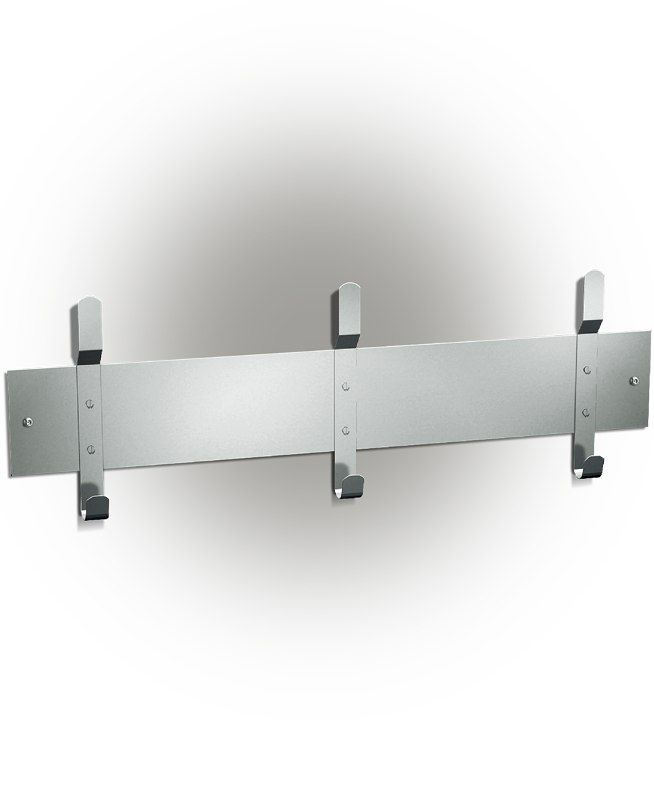 Fabricated of type 304 satin finish stainless steel, our one-piece constructed custodial accessories—with various configurations of mop and broom holders and utility hooks—help keep necessary cleaning tools and supplies organized and accessible.